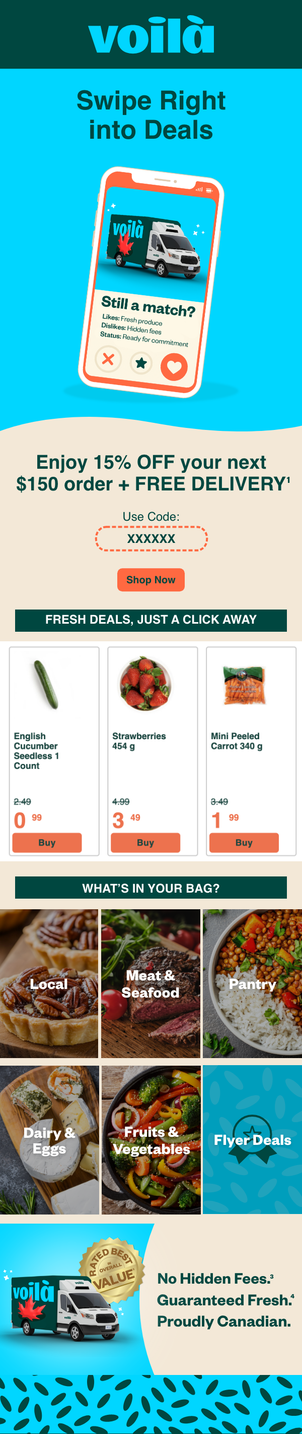 Voilà is a cutting-edge online grocery home delivery service in the Greater Toronto Area, the Greater Montreal Area, Ottawa, the Calgary Area, the Edmonton Area, and Quebec City. Voilà promises customers guaranteed freshness, at affordable prices, straight to your door. Voilà was launched in early 2020 and continues to expand its competitive grocery delivery service across Canadian provinces.
